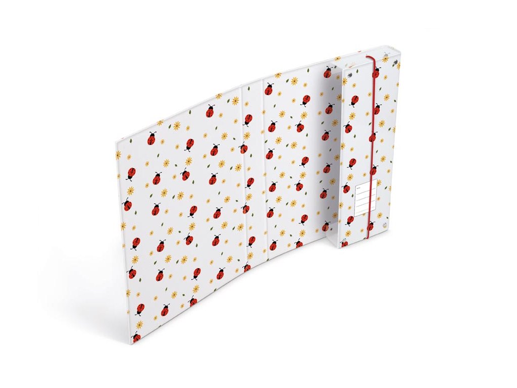 Box na zošity vo formáte A4 s pružnou gumičkou, motív Lienky. Rozmer: 230mm x 320mm x 45mm (Š x V x H)