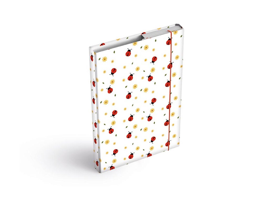 Box na zošity vo formáte A5 s pružnou gumičkou, motív Lienky. Rozmer: 163mm x 230mm x 38mm (Š x V x H)