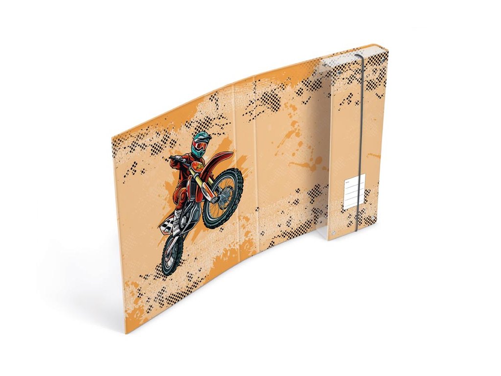 Box na zošity vo formáte A4 s pružnou gumičkou, motív Motorka. Rozmer: 230mm x 320mm x 45mm (Š x V x H)