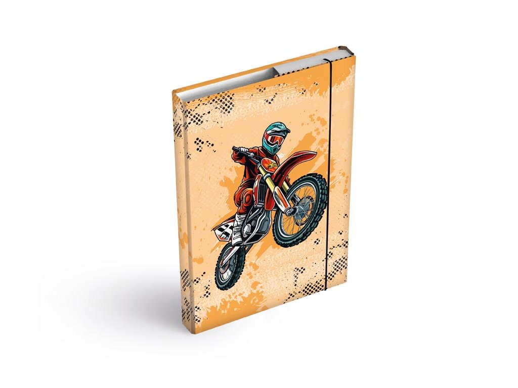 Box na zošity vo formáte A5 s pružnou gumičkou, motív Motorka. Rozmer: 163mm x 230mm x 38mm (Š x V x H)