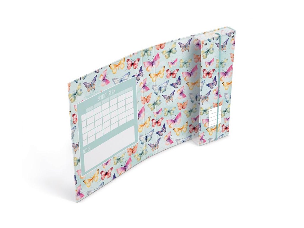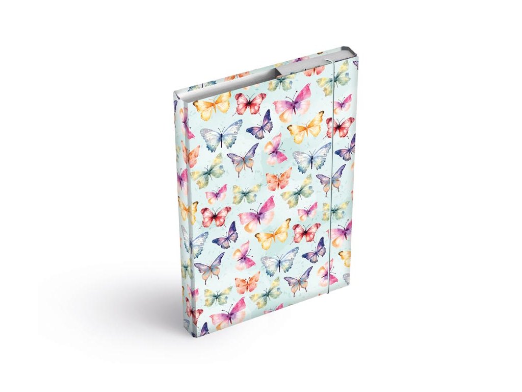 Box na zošity vo formáte A4 s pružnou gumičkou, motív Motýle. Rozmer: 230mm x 320mm x 45mm (Š x V x H)