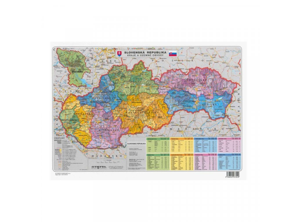 Praktická mapa Slovenskej republiky s územnosprávnym aj geografickým členením, obsah pomáha podrobnejšie poznávať našu vlasť, pomocou tejto mapy budete vedieť charakterizovať geografickú polohu a rozlohu SR aj v kontexte strednej Európy, orientovať sa v prírodných podmienkach SR, popísať jej povrch a členenie, ako aj administratívne členenie. Mierka: 1 : 1 100 000, materiál: lamino, rozmer: 422 x 297 mm
