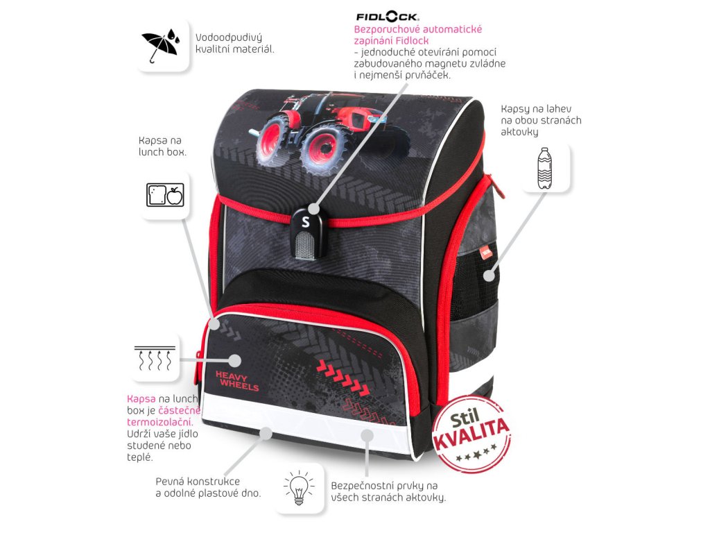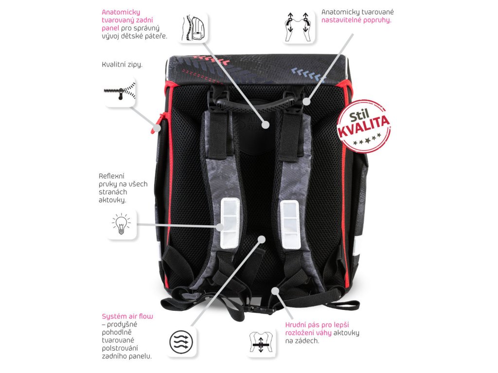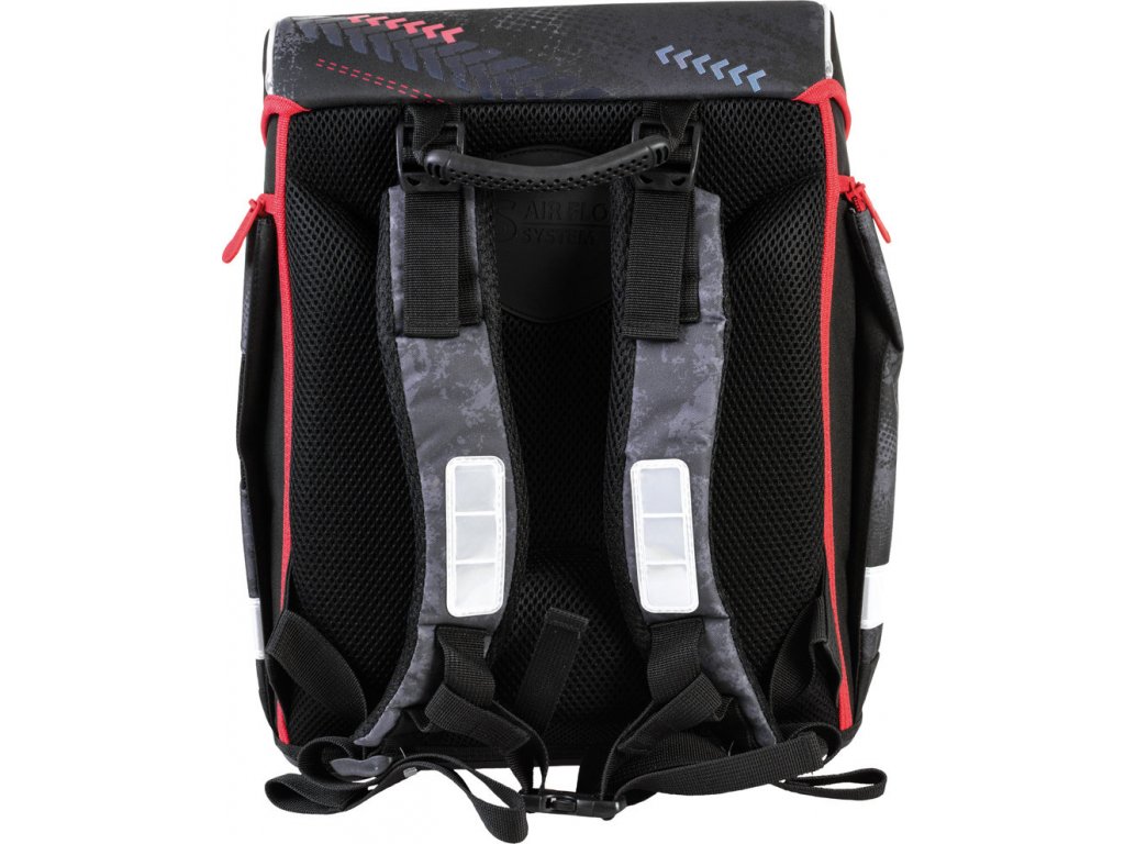 Chrbát tašky je anatomicky tvarovaný, s priedušným polstrovaním Air flow umožňujúcim cirkuláciu vzduchu. Vnútorná časť aktovky je rozdelená textilnou prepážkou. Bočné vrecká so zipsovým zapínaním sú ideálne na fľašu, predné vrecko na desiatový box. Prídavné ramenné popruhy umožňujú lepšie usadenie aktovky na chrbte, hrudná pracka zaručí rovnomerné rozloženie váhy tašky na chrbte.