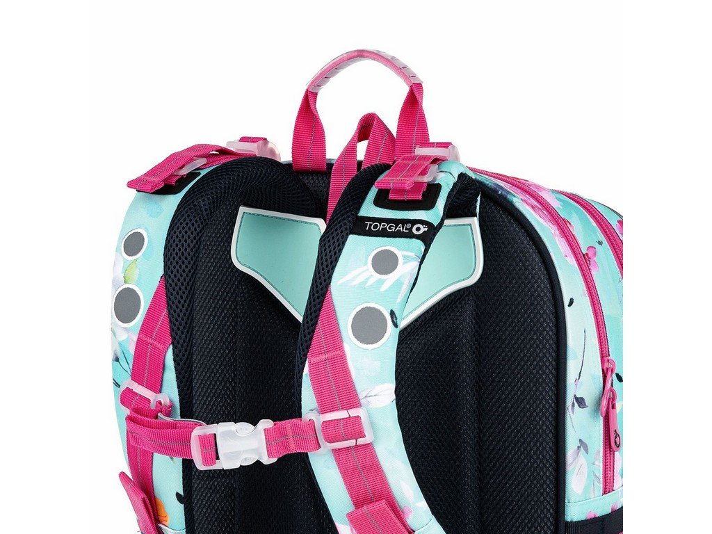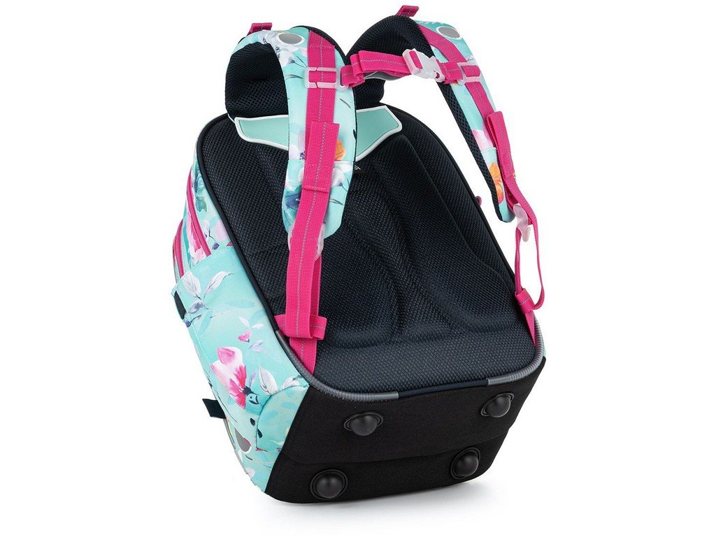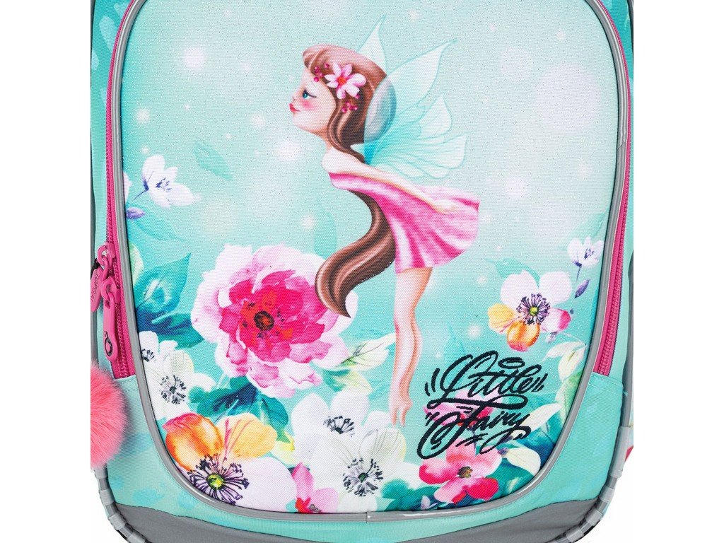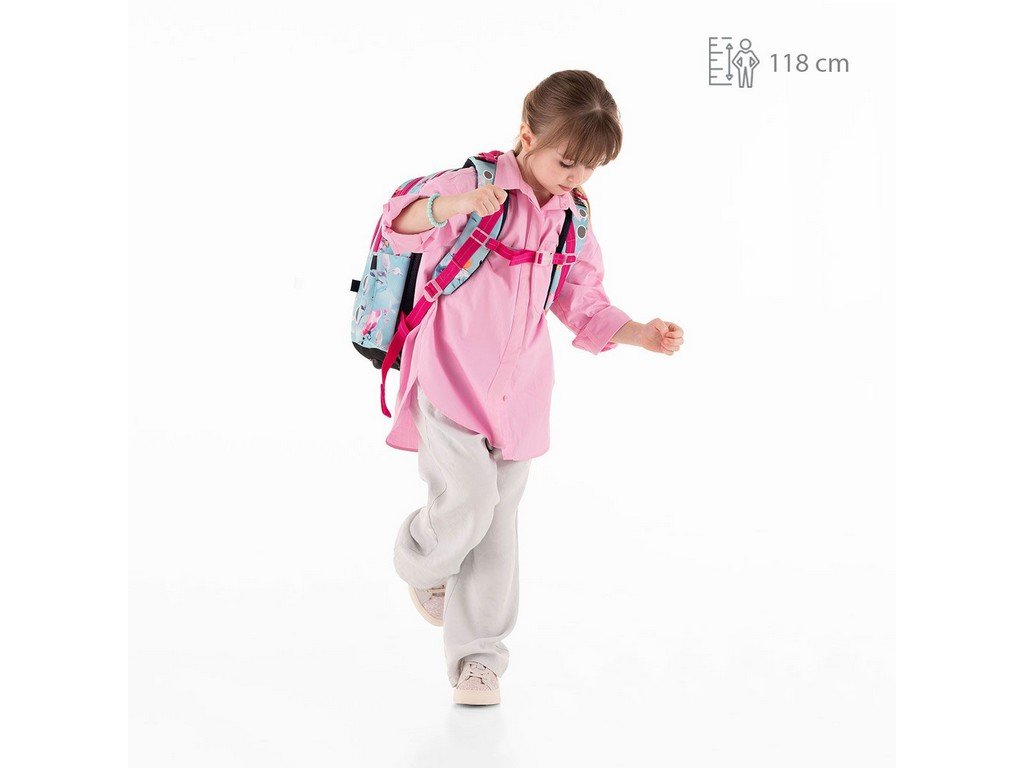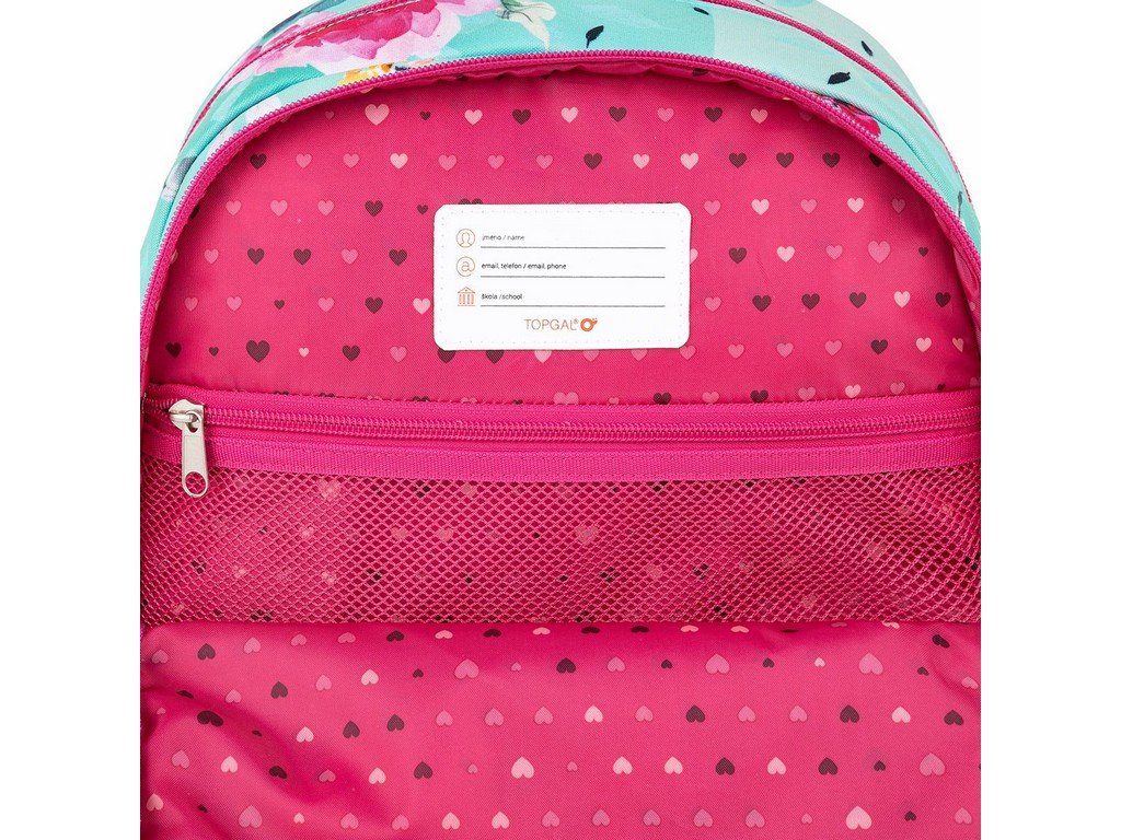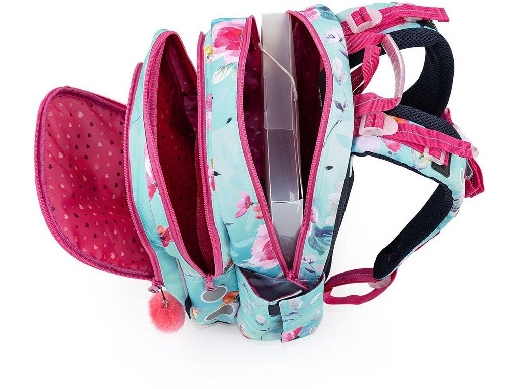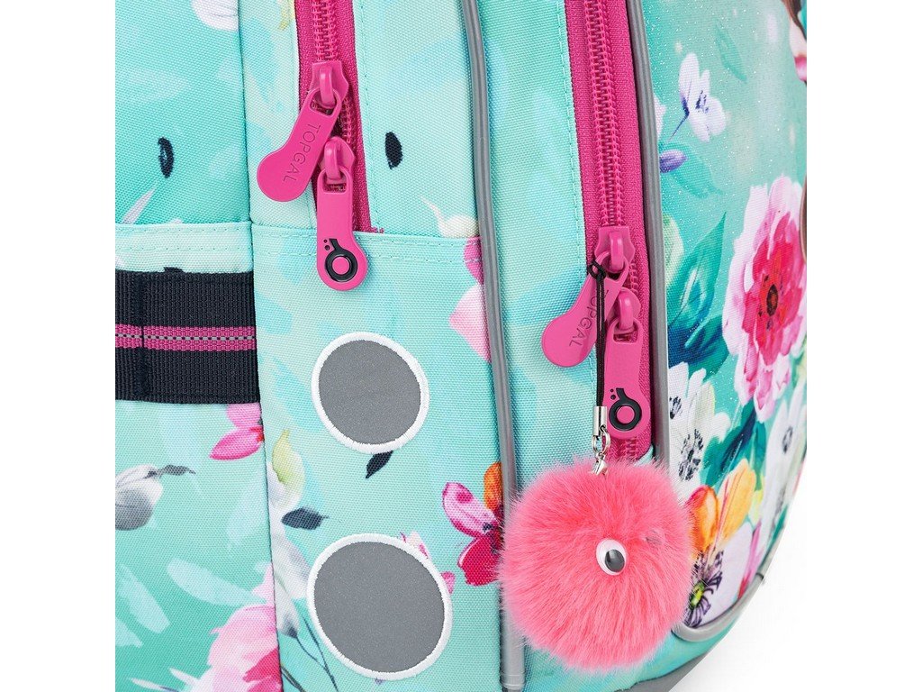 Dve hlavné komory dopĺňa na čele tašky hlboké vrecko. Zadná komora je hlbšia, dáte do nej tie najťažšie šlabikáre a učebnice. Predná komora je o niečo užšia, ideálne je dať do nej napríklad peračník a ďalšie drobné školské potreby. Malé drobnosti dáte do sieťového vrecká na zips vnútri prednej komory. Predné vrecko je dostatočne hlboké, môžete ho použiť napríklad na prenášanie desiatového boxu. Vnútri vrecka je aj odnímateľná karabínka na kľúče.