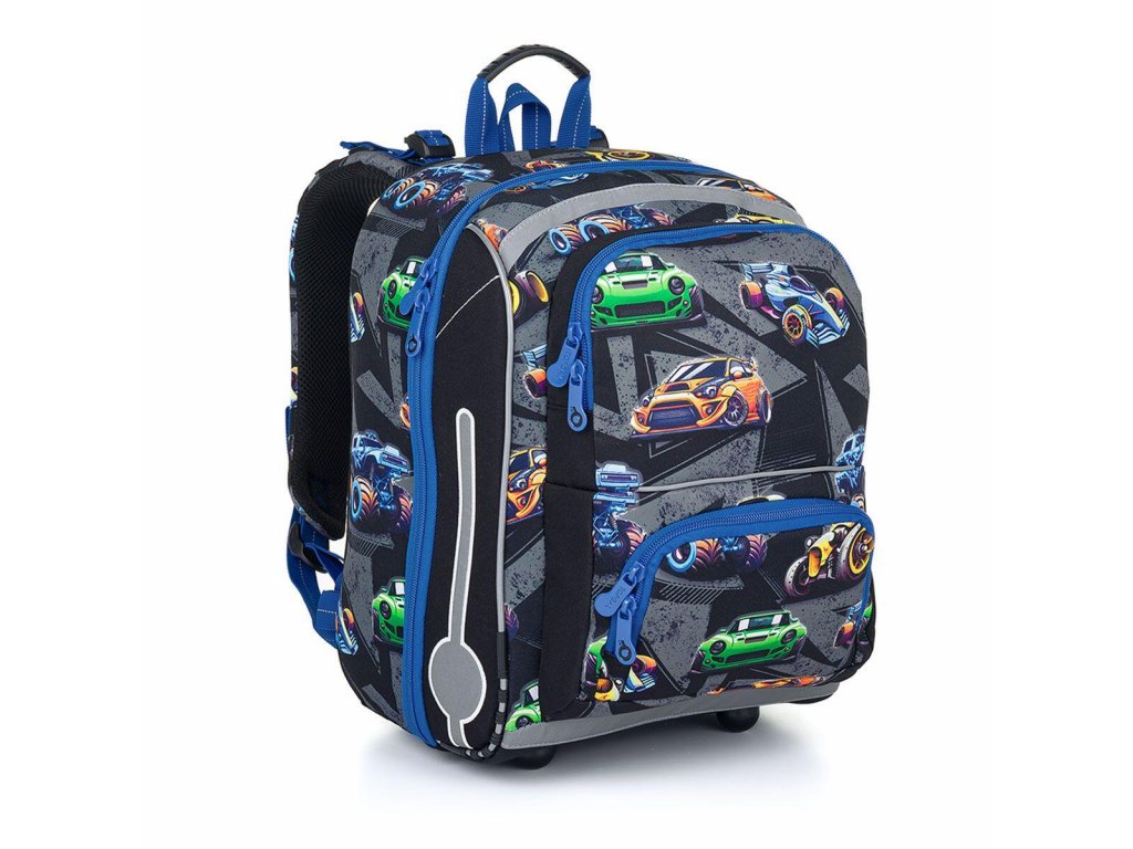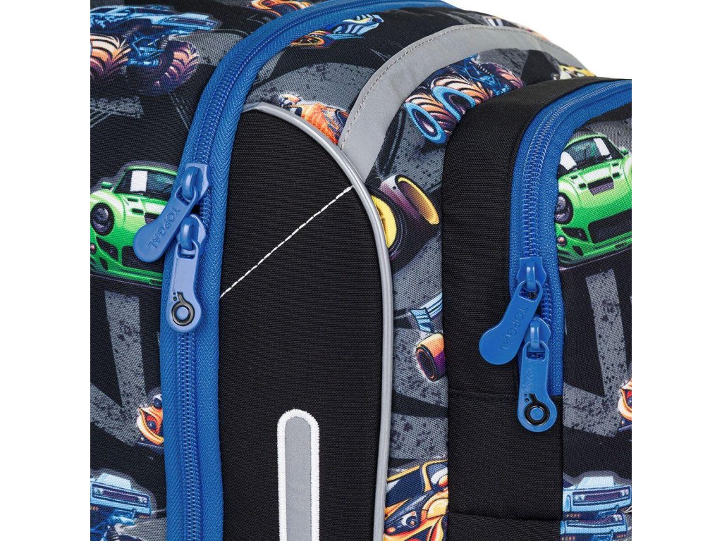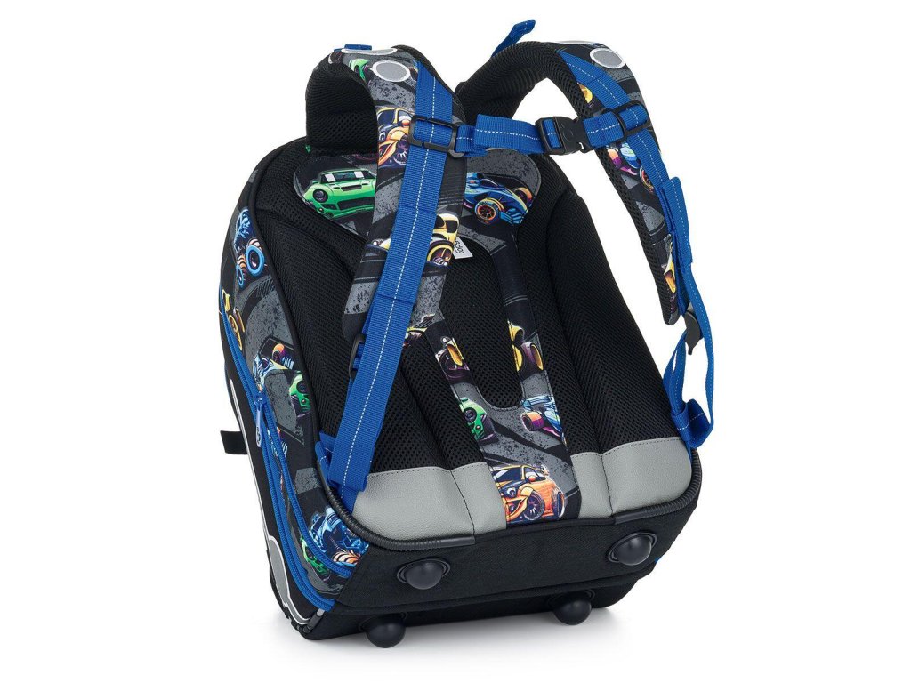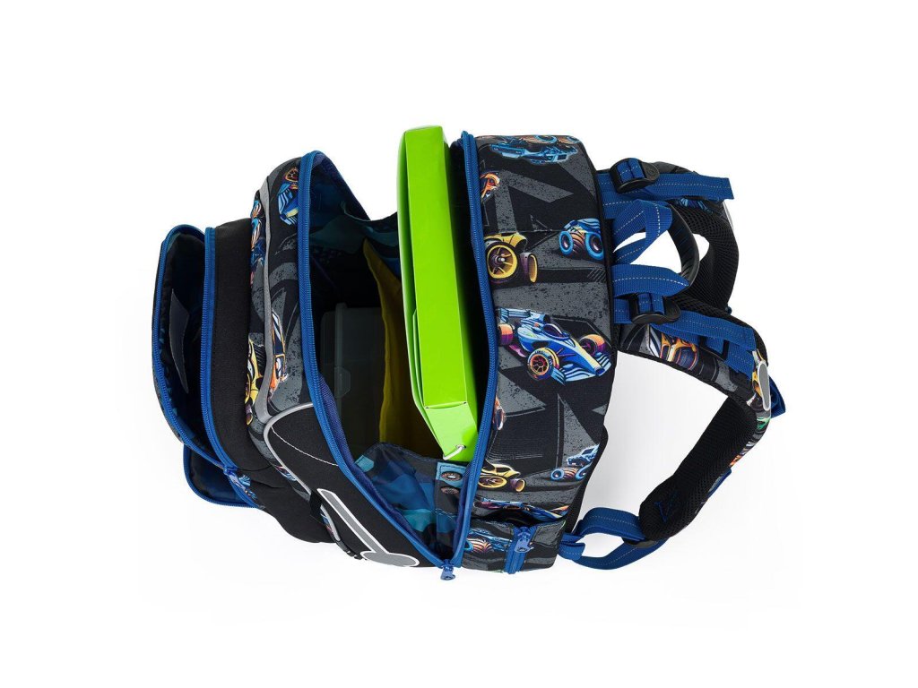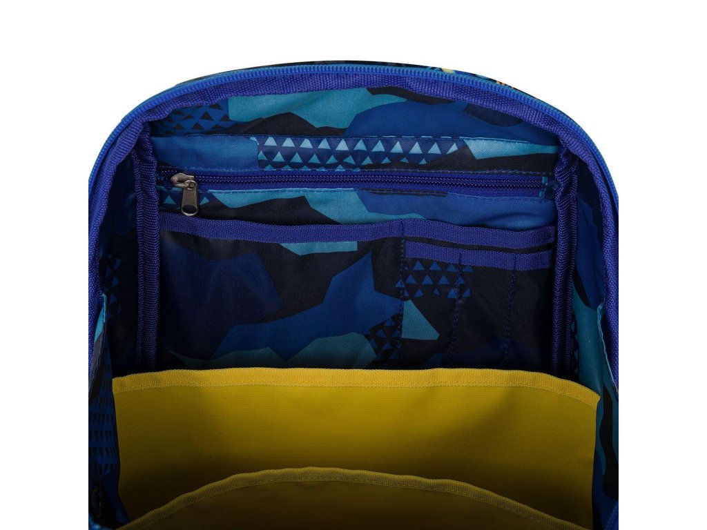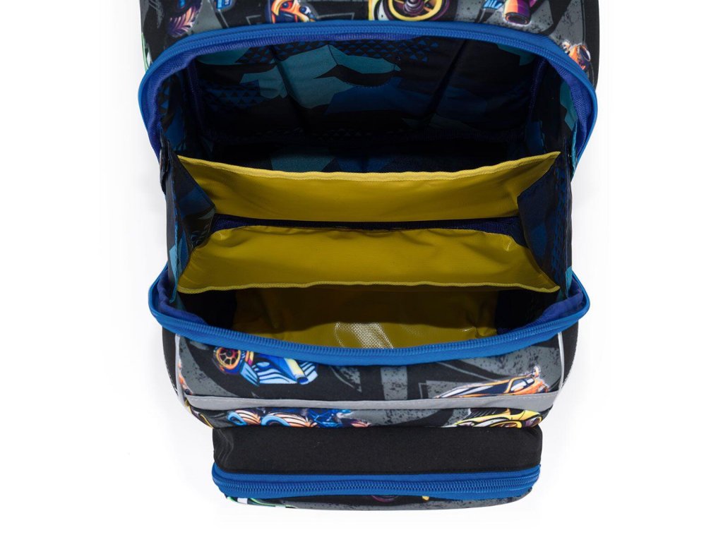 Batoh má jednu veľkú komoru so žltým nepriepustným organizérom. Na prednej časti aktovky nájdete ďalšie dve praktické vrecká na zips, vo vnútornom vrecku je menovka.