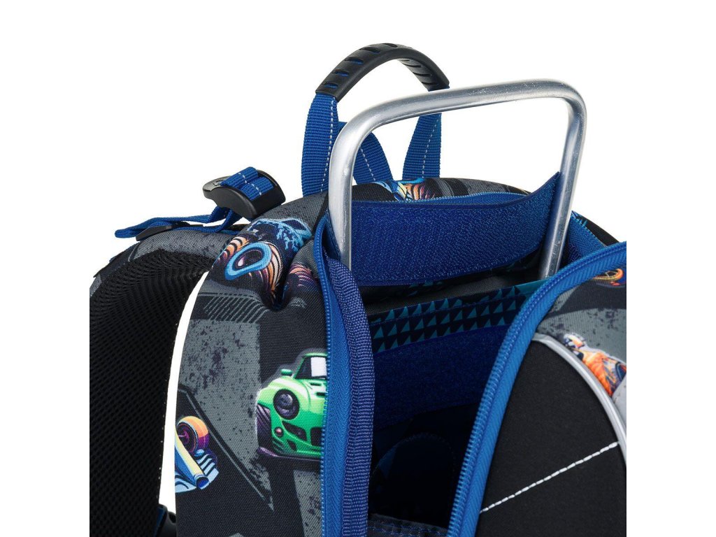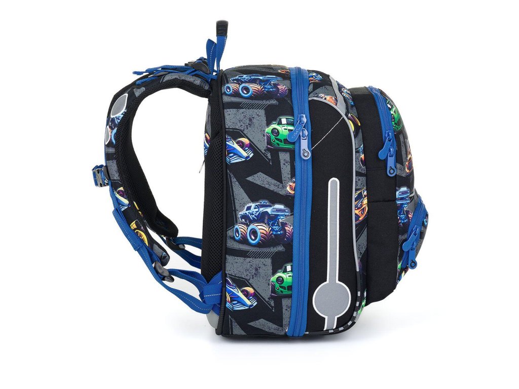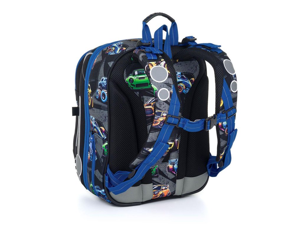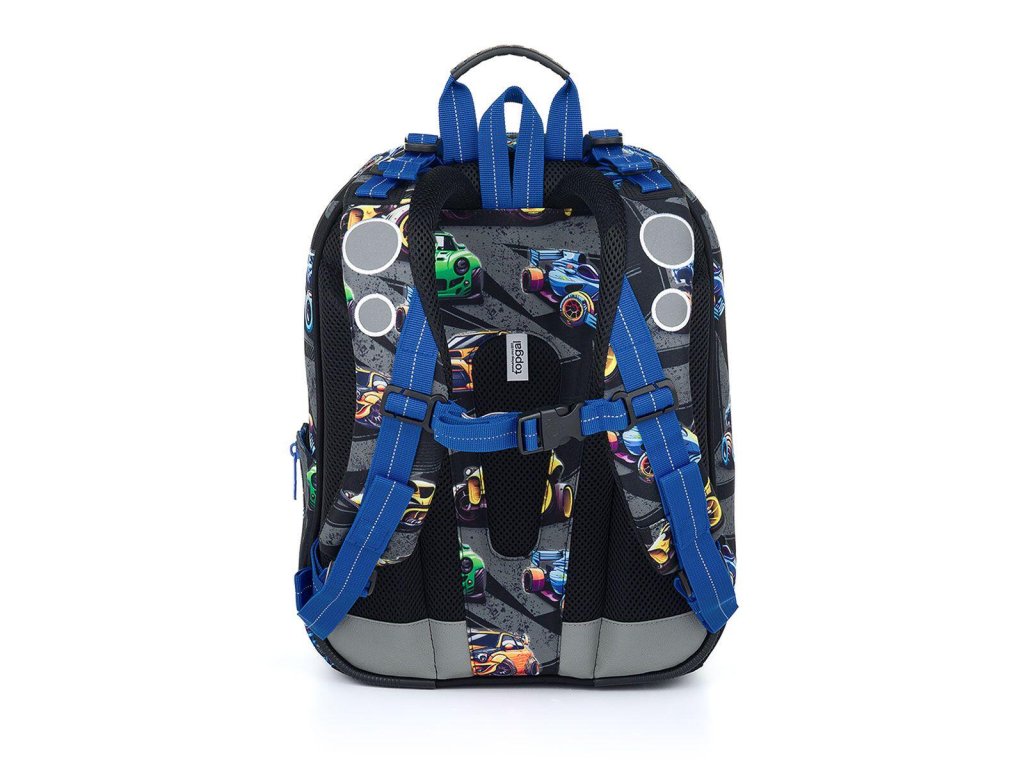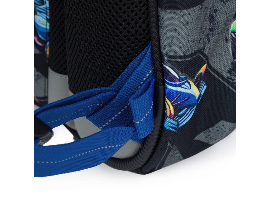 Do horného vrecka sa zmestí aj peračník v rovnakom dizajne alebo krabička na desiatu. Do bočných vreciek krásne sedia fľaštičky s objemom 0,5 litra. Konce popruhov batohu sú opatrené magnetkami. Tie slúžia na pripnutie na polstrovanú časť ramenného popruhu. Tým sa zabráni tomu, aby voľné konce popruhov poletovali okolo tela dieťaťa.