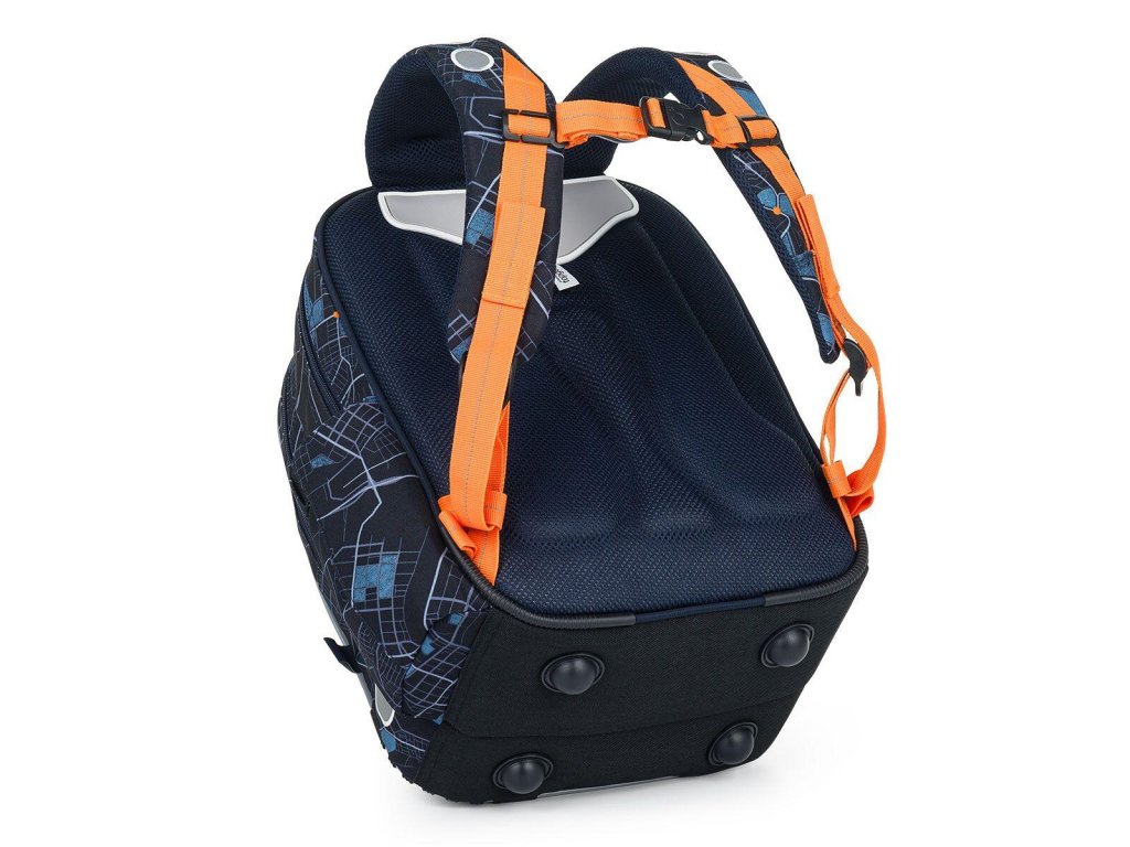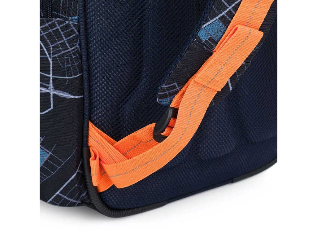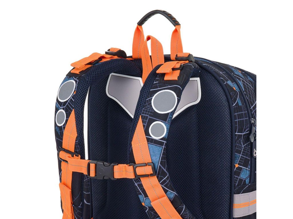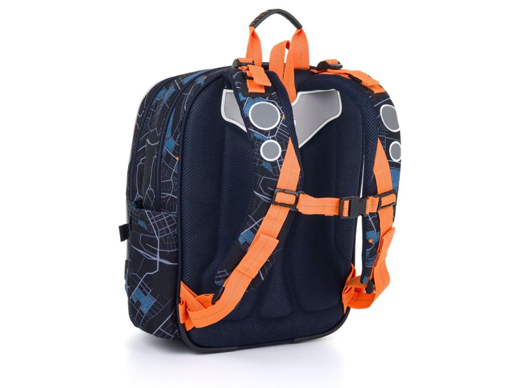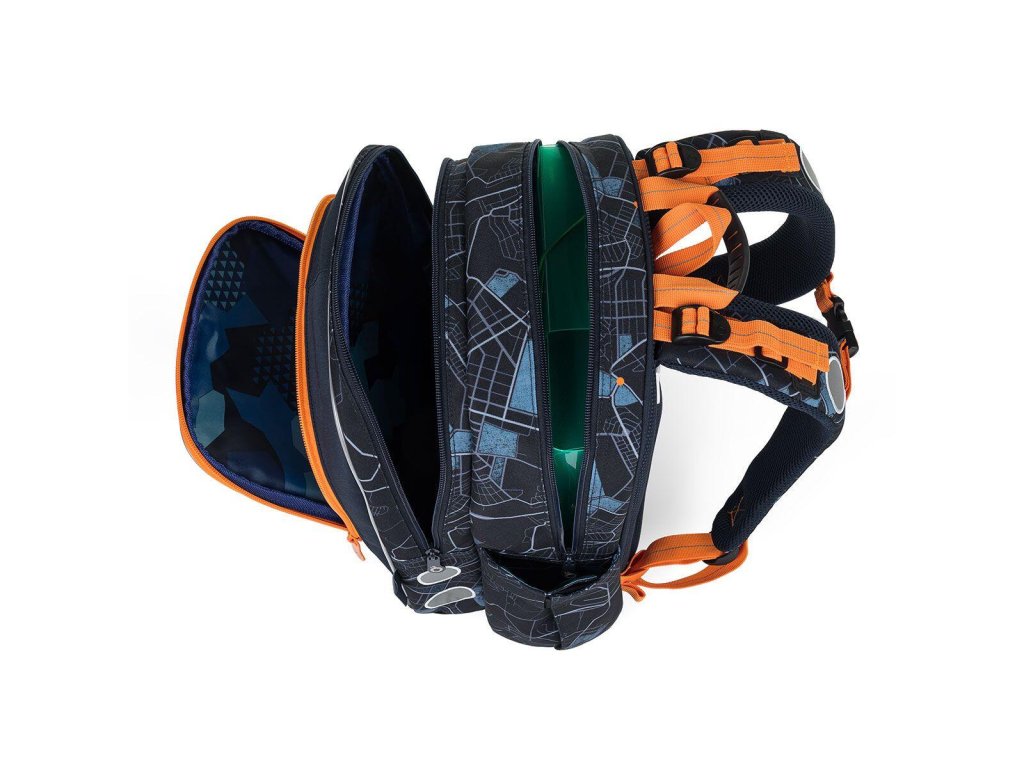 Batoh má dve hlavné komory. Zadná komora je širšia - odporúčame k chrbtu dávať najťažšie učebnice alebo dosky na zošity. Predná komora je o niečo užšia je v nej umiestnené malé sieťové vrecko na zips a praktická menovka.