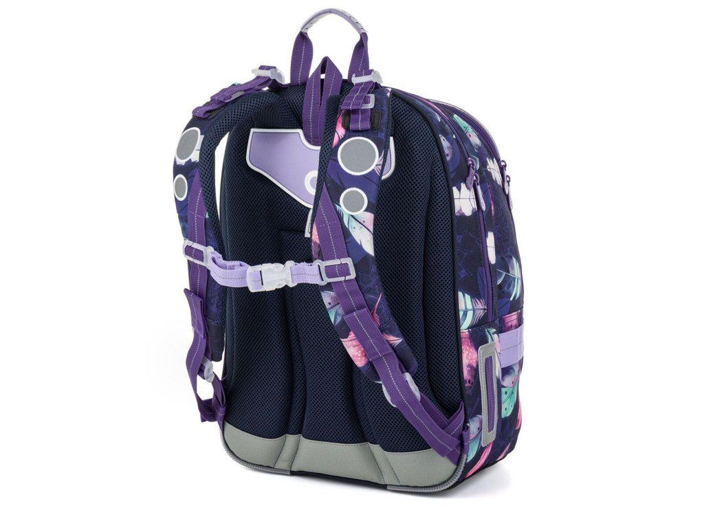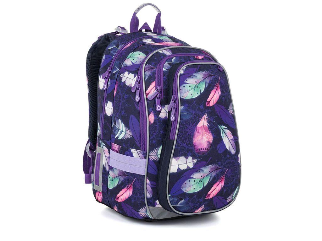Školská taška LYNN 26008 je priestranný dvojkomorový model, aška je vhodná pre dievčatá od 1. do 4. ročníka. Tmavofialový dizajn s farebnými pierkami v boho štýle pôsobí originálne a elegantne.