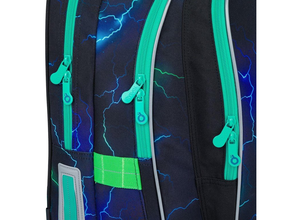 Zadná komora batohu je užšia a nájdete v nej menšie sieťové vrecko na zips. Predná komora je širšia, veľmi objemná a je rozdelená polstrovanou prepážkou na dve časti. Hlboké vrecko na prednej komore je ako stvorené pre peračník.