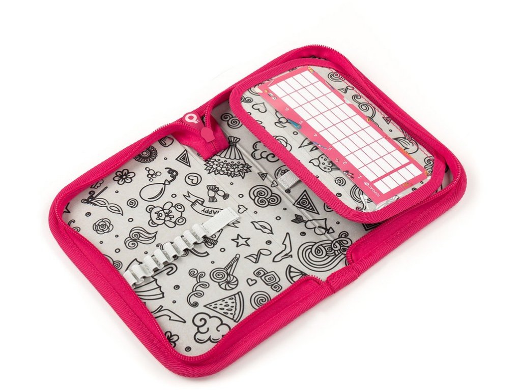 Jednokomorové školské puzdro je vybavené osemnástimi klasickými gumovými úchytmi na pastelky a fixky, štyrmi širšími úchytmi na pravítka, kružidlo či nožnice, a dvoma väčšími úchytmi na gumu a strúhadlo. Pod chlopňou z priehľadnej fólie nájdete rozvrh hodín.