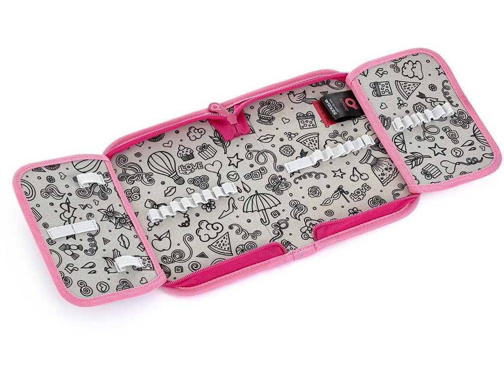 Jednokomorové školské puzdro je vybavené 21 klasickými gumovými úchytmi na pastelky a fixky, štyrmi širšími úchytmi na pravítka, kružidlo či nožnice, a dvoma väčšími úchytmi na gumu a strúhadlo. Pod chlopňou z priehľadnej fólie nájdete rozvrh hodín. Peračník je polstrovaný, takže spoľahlivo ochráni všetky písacie potreby vašich detí. Zapínanie je riešené kvalitnými zipsmi s veľkými ťaháčikmi, ktoré umožňujú deťom ľahkú manipuláciu s puzdrom.