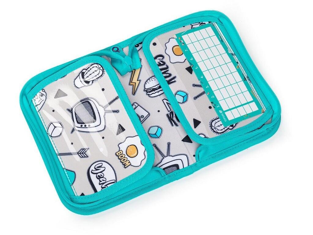 Jednokomorové školské puzdro je vybavené 21 klasickými gumovými úchytmi na pastelky a fixky, štyrmi širšími úchytmi na pravítka, kružidlo či nožnice, a dvoma väčšími úchytmi na gumu a strúhadlo. Pod chlopňou z priehľadnej fólie nájdete rozvrh hodín. Peračník je polstrovaný, takže spoľahlivo ochráni všetky písacie potreby vašich detí. Zapínanie je riešené kvalitnými zipsmi s veľkými ťaháčikmi, ktoré umožňujú deťom ľahkú manipuláciu s puzdrom.