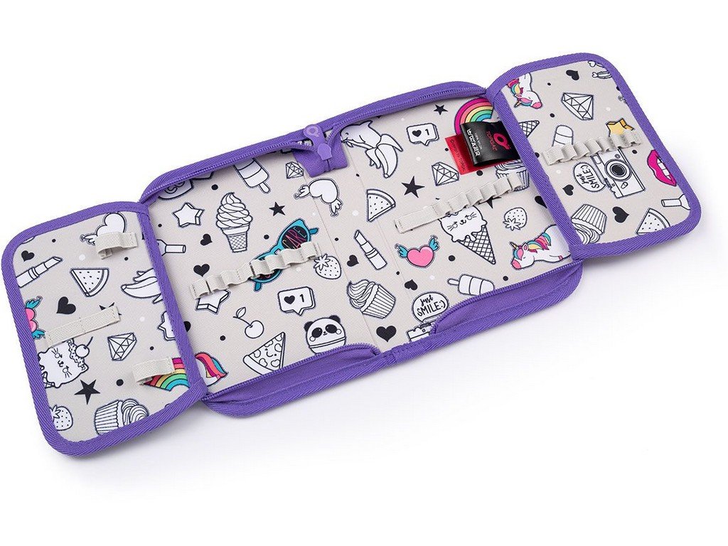 Jednokomorové školské puzdro je vybavené 21 klasickými gumovými úchytmi na pastelky a fixky, štyrmi širšími úchytmi na pravítka, kružidlo či nožnice, a dvoma väčšími úchytmi na gumu a strúhadlo. Pod chlopňou z priehľadnej fólie nájdete rozvrh hodín. Peračník je polstrovaný, takže spoľahlivo ochráni všetky písacie potreby vašich detí. Zapínanie je riešené kvalitnými zipsmi s veľkými ťaháčikmi, ktoré umožňujú deťom ľahkú manipuláciu s puzdrom.